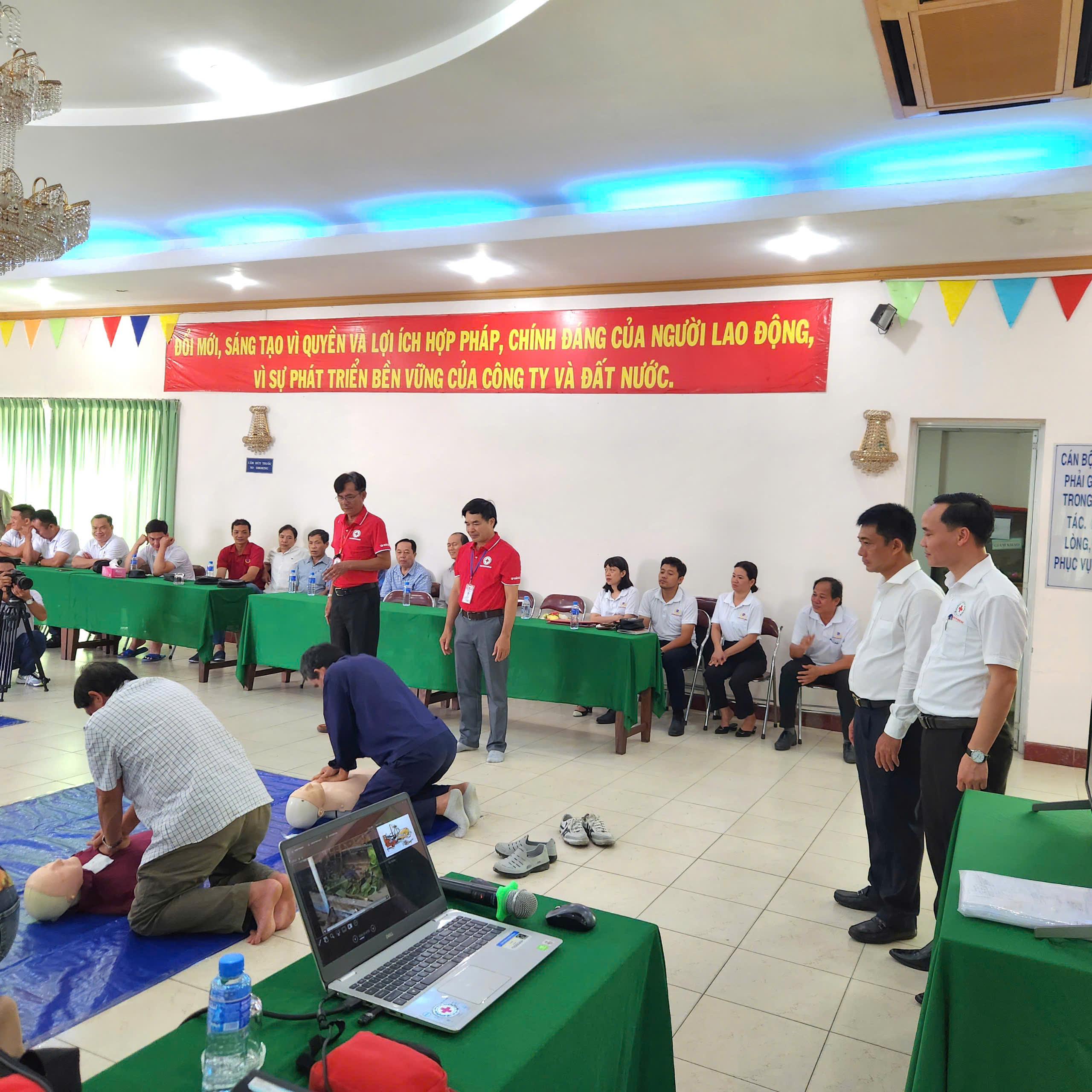 Công nhân lao động được học kĩ năng tiếp cận đánh giá bệnh nhân, cầm máu, cố định xương gãy, bỏng, giật điện, dị vật đường thở, ngộ độc…