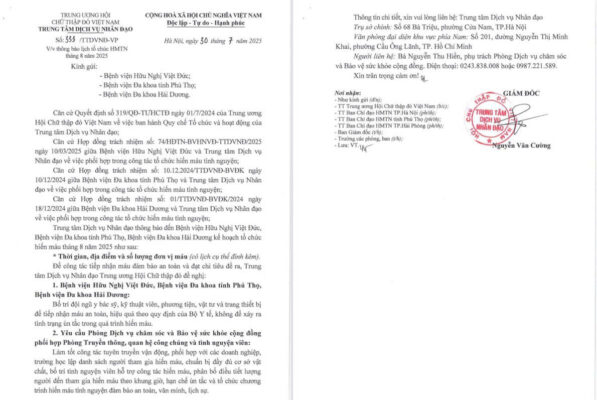 Sáng ngày 15/8/2025, tại địa bàn tỉnh Vĩnh Phúc (cũ), Trung tâm Dịch vụ Nhân đạo Trung ương Hội Chữ thập đỏ Việt Nam phối hợp với Hội Chữ thập đỏ tỉnh Vĩnh Phúc (cũ) và Viện Huyết học Truyền máu TW, Bệnh viện Đa khoa tỉnh Phú Thọ tổ chức hiến máu tại Công ty TNHH Toyota Hiroshima Vĩnh Phúc – HT và Trung tâm Giáo dục Quốc phòng Hà Nội 2.